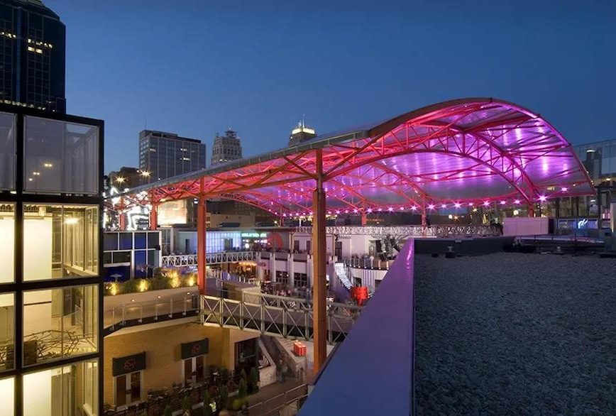 對(duì)于戶外商場(chǎng)的屋頂,設(shè)計(jì)師設(shè)計(jì)并開發(fā)了一個(gè)單層ETFE張力膜結(jié)構(gòu)。結(jié)構(gòu)鋼框架上的 ETFE薄膜提供了20000平方米的遮蔽空間和低層陰影,以抵消該地區(qū)的高溫和直射陽(yáng)光。工廠將銀色印點(diǎn)應(yīng)用于膜的下側(cè),可改善紫外線屏蔽并減少太陽(yáng)能;到了晚上,高科技LED 燈系統(tǒng)會(huì)投射到ETFE膜上,在現(xiàn)場(chǎng)和更大的天際線中營(yíng)造視覺(jué)趣味。