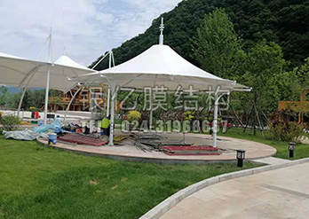 景觀膜結(jié)構(gòu)罩棚使用壽命長,不同的膜材使用壽命從10年到30年不等,施工工期短,由于膜結(jié)構(gòu)頂棚是工廠加工后直接現(xiàn)場安裝,所以在造價(jià)以及施工速度方面有著明顯的優(yōu)勢