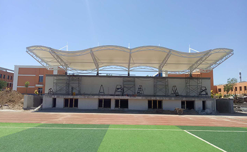 其膜一般采用PTFE或pvc膜材來(lái)做為膜結(jié)構(gòu)罩棚建筑的膜材。其膜材主要特點(diǎn)為具有良好的環(huán)保性、透光性、自清潔性,膜材表面采用PVDF(聚偏二氟乙烯)涂層、或二氧化鈦涂層,具有較好的隔熱效果,對(duì)太陽(yáng)熱能可反射掉70%,膜材本身吸收了17%,傳熱13%,而透光率卻在20%以上,經(jīng)過(guò)10年的太陽(yáng)光直接照射,其輝度仍能保留70%。大大正加了膜結(jié)構(gòu)罩棚的使用壽命。